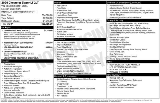 Black 2026 Chevrolet Blazer LT FWD 9-Speed Automatic with Overdrive 2.0L Turbocharged